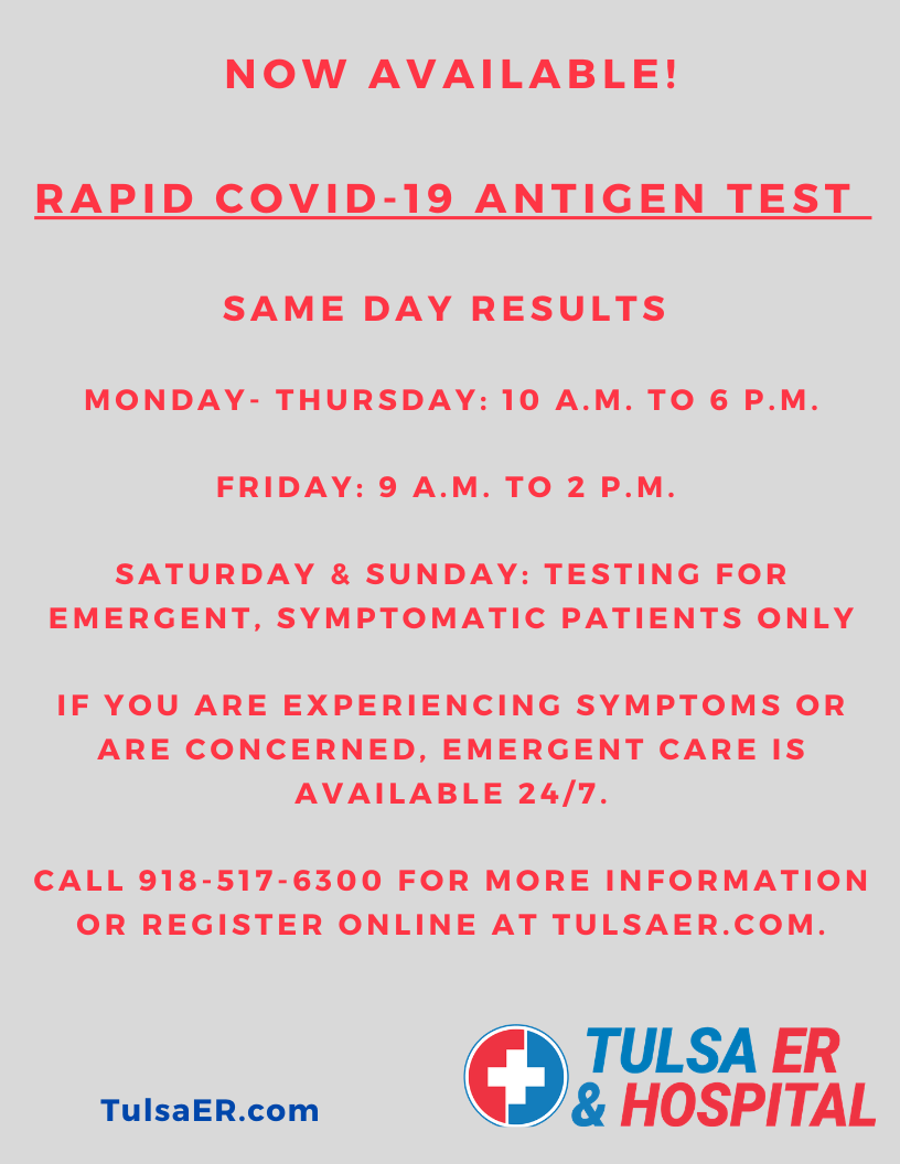 . Officials said normal testing hours will continue next Monday from 10 am. Tulsa ER Hospital Hospital is located in Creek County Oklahoma United States. Saint Francis emergency services are offered 24 hours a day seven days a week at emergency centers in Tulsa and across eastern Oklahoma.
